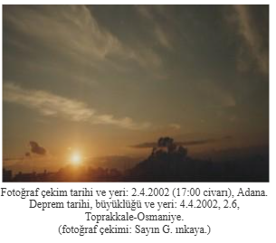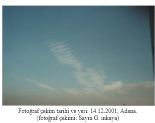 ızmit Depremine tanık olan birkaç kişi deprem öncesinde hızla ve tek doğrultuda akan sıra dışı bulutlar gözlediklerini ifade etmelerine karşın, net bir çizime ulaşılamazken; deprem sonrasında, ızmit, Adapazarı civarında artçı depremlerin sürdüğü günlerdeki veri toplama çalışmamız sırasında pembe gökyüzüne yayılan ince, tek doğrultuda, yüzlerce metre uzunluktaki bulutlar tarafımızdan fotoğraflanmıştır (Ulusoy ve Ikeya, 2001). Ayrıca, çalışmamızdan bağımsız olarak, Adana’dan ev hanımı Sayın G. ınkaya, yıllardır depremlerle bağlantılı olarak dikkatini çeken bulut biçimlerini çizim ve fotoğraflarla tarif ederek eski ve yeni gözlemlerini bizimle paylaşan ilk gözlemci olmuştur (2001).
