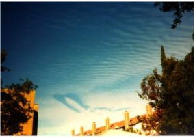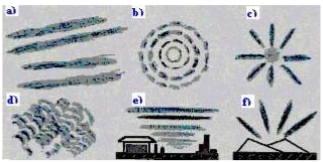 Yerden gözleyen tanıklar tarafından tarif edilen çeşitli biçimlerdeki deprem bulutları (Kagita, 1983). a) Depremden iki gün önce, mavi gökyüzünde beyaz çizgisel bulutlar, b) su yüzeyinde oluşan dalgalara benzeyen tek merkezli içi içe dairesel bulutlar, c) bir merkezden yayılan ışınsal bulutlar, d) saçak bulutlar (sirüs), e) eşmerkezli bulutların belli bir açıdan görünümü (yatay paralel bulutlar), f) ışınsal bulutların bir başka tarifi. |  Kalifornia Depremi (6.6 büyüklüğünde, 19 şubat 1995) öncesinde fotoğraflanmış deprem bulutu. (http://quake.exit.com/images_1999.htm)