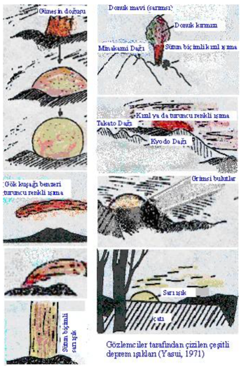 Elektriğin kullanılmaya başlanmasının çok öncesinde, depremler ile ışıma olayları arasında bağlantı kurulmasına karşın; olaylar, ancak 1975’li yıllarda bilimsel olarak çalışılan konular arasına girebilmiştir. Yasui (1971), çeşitli gözlemcilerin tarif ve çizimlerine dayanarak, deprem ışıklarını aşağıdaki gibi gruplandırmıştır.