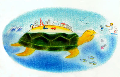“Diğer efsaneler ise büyük bir kaplumbağadan söz eder.” der Uyuşuk. O, dünyayı sırtında taşır, öfkelendiği zaman yer sallanır ve hepimiz yükseklere doğru koşarız çünkü tusunami denen büyük bir dalga gelebilir.”